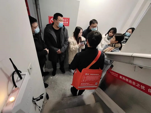 同時,樓梯道每一層樓安裝有位置追蹤器,實時接收、采集高樓應急自救裝置發送的信號,準確顯示逃生人員位置,可實現智聯報警、準確定位、精準救援。目前,該系統已在灃西新城居民小區大力推廣實施。
