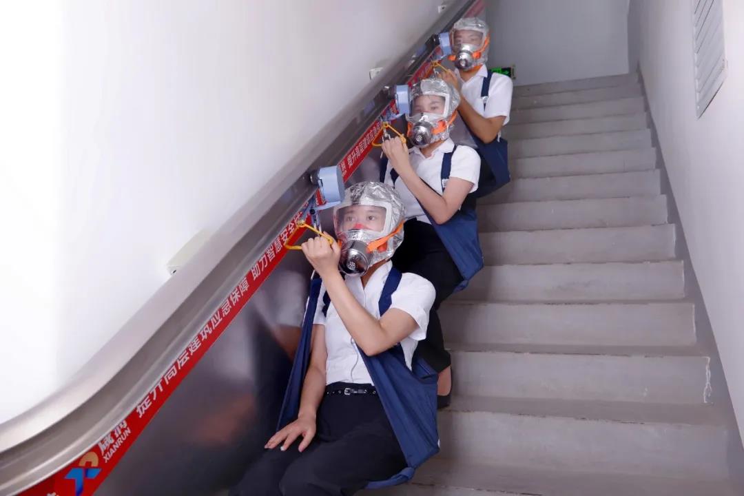 該系統通過安裝自主研發的專用扶手軌道,使用配套的自救逃生裝置,快速下行逃生,且過程可自控速度,從30層樓下行至1樓僅需3分鐘左右。同時,配合自主研發的智聯系統及APP管理平臺,在逃生過程中實現及時報警、準確定位,并為消防救援人員提供位置追蹤信息,做到精準施救。