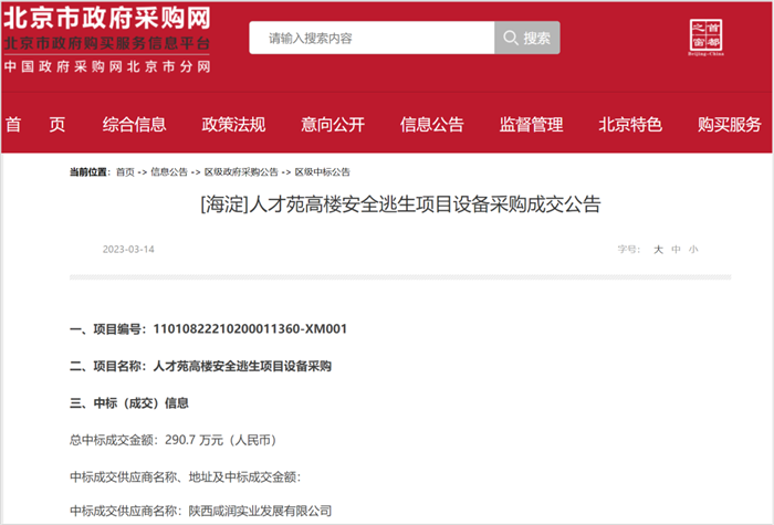 咸潤(rùn)自主研發(fā)的“高樓應(yīng)急安全逃生智聯(lián)系統(tǒng)”以單一來(lái)源采購(gòu)中標(biāo)北京市海淀區(qū)人才苑高樓安全逃生項(xiàng)目設(shè)備采購(gòu)項(xiàng)目。這是我司近期的一項(xiàng)重要成果,也是我們?cè)诟邔咏ㄖ踩I(lǐng)域的又一次重要實(shí)踐!