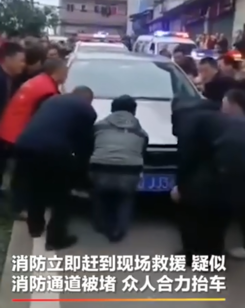 火情發生后,當地消防救援隊第一時間趕到小區,可由于消防通道被堵導致消防車難以駛入。從現場視頻可以看到,小區居民正在合力抬一輛私家車,為消防車開辟救援通道。一個多小時后明火被撲滅,但最終導致6人死亡。