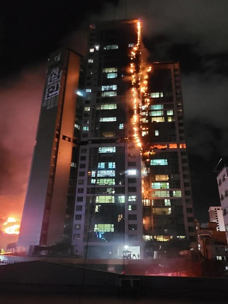 據韓聯社報道,韓國蔚山市一棟33層的商住樓8日晚11時7分許發生大火。經過13個半小時的撲救工作,外部的明火已經被撲滅,消防人員正繼續清理火災隱患。