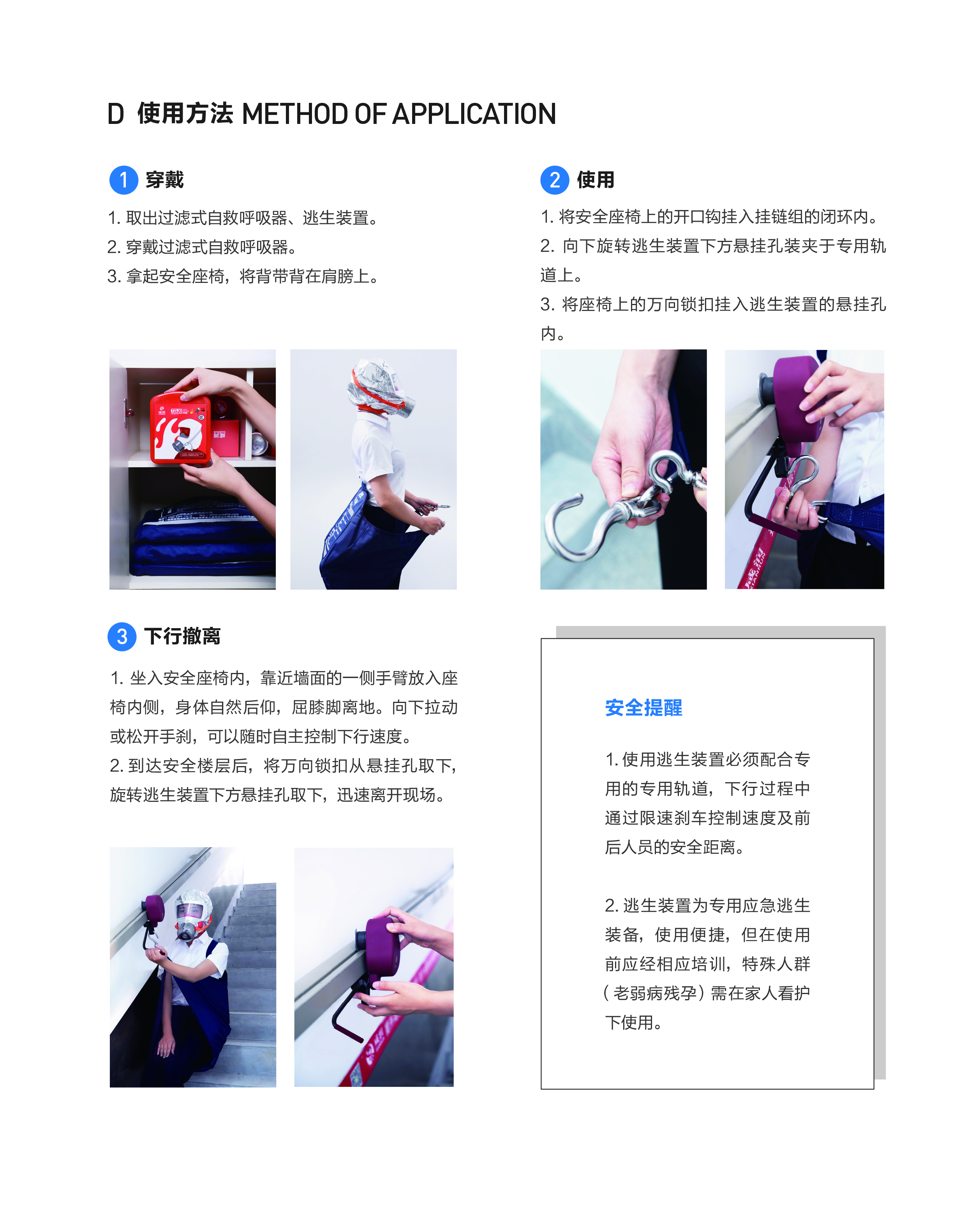 2. 逃生裝置為專用應急逃生裝備,使用便 捷,但在使用前應經(jīng)相應培訓,特殊人群(老弱病殘孕)需在家人看護下使用。